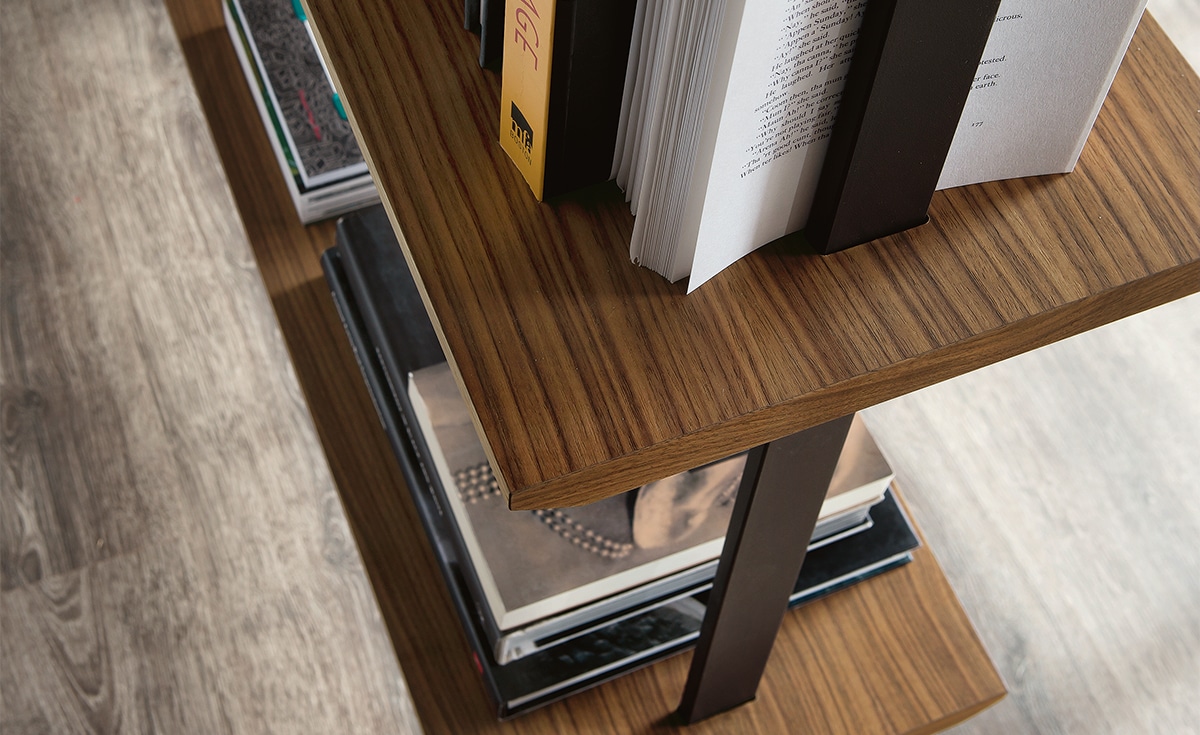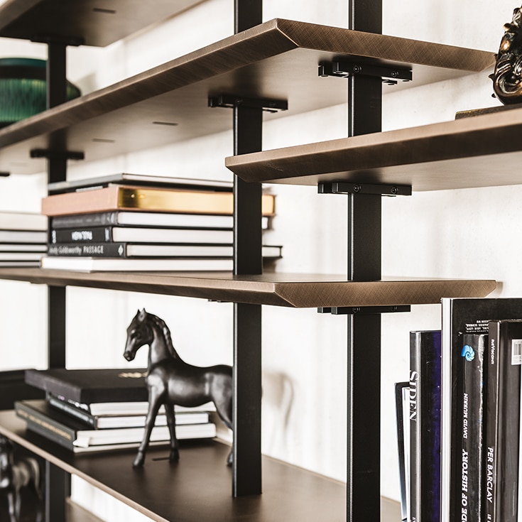 Il design della libreria Airport è stato sviluppato tenendo conto della ricerca sui materiali di altissima qualità, il che si traduce in una robustezza e durata nel tempo. I ripiani, realizzati in legno, sono disponibili in una selezione di 11 finiture diverse, comprendenti legni pregiati e acciaio, garantendo così un elevato grado di personalizzazione per ogni cliente. Tra le finiture più recenti, troviamo il Brushed Bronze e il Brushed Grey, che non solo aggiungono un valore estetico significativo, ma contribuiscono anche a creare atmosfere calde e accoglienti all’interno del living.
