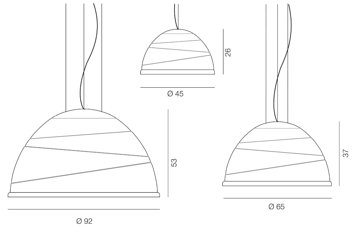Babele è disponibile in tre varianti di diametro: Ø 45 cm, Ø 65 cm e Ø 92 cm, permettendo una flessibilità nella scelta in base agli spazi e alle esigenze di illuminazione. La sospensione avviene tramite cavi in acciaio, che conferiscono stabilità e un tocco industriale al design, rendendo la lampada adatta sia a contesti residenziali che commerciali.