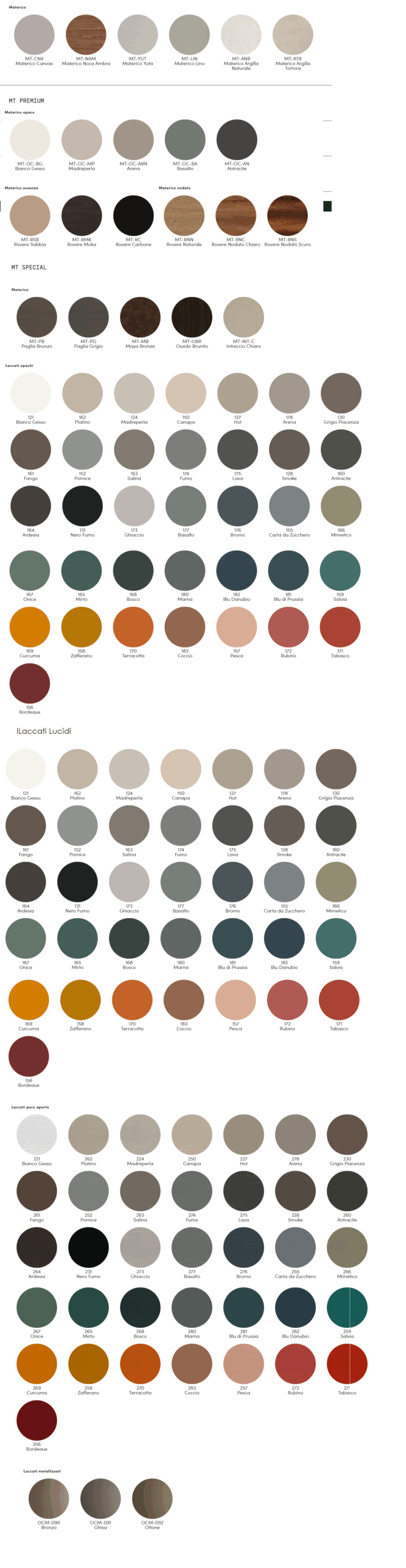 Finiture disponibili piano  materic/ laccati poro aperto/ laccati opachi/ laccati lucidi.