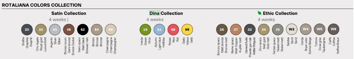 | Colore | bronzo opaco, Bronzo Scuro, Champagne, Oro opaco, Oro Regale, Rame opaco, Caffè 903, Bianco opaco, Corda, Canna di fucile, Tortora, Bronzo, Argento, Nichel, Sabbia, Azzurro, Rosso, Giallo, Verde, Grafite, Nero opaco |