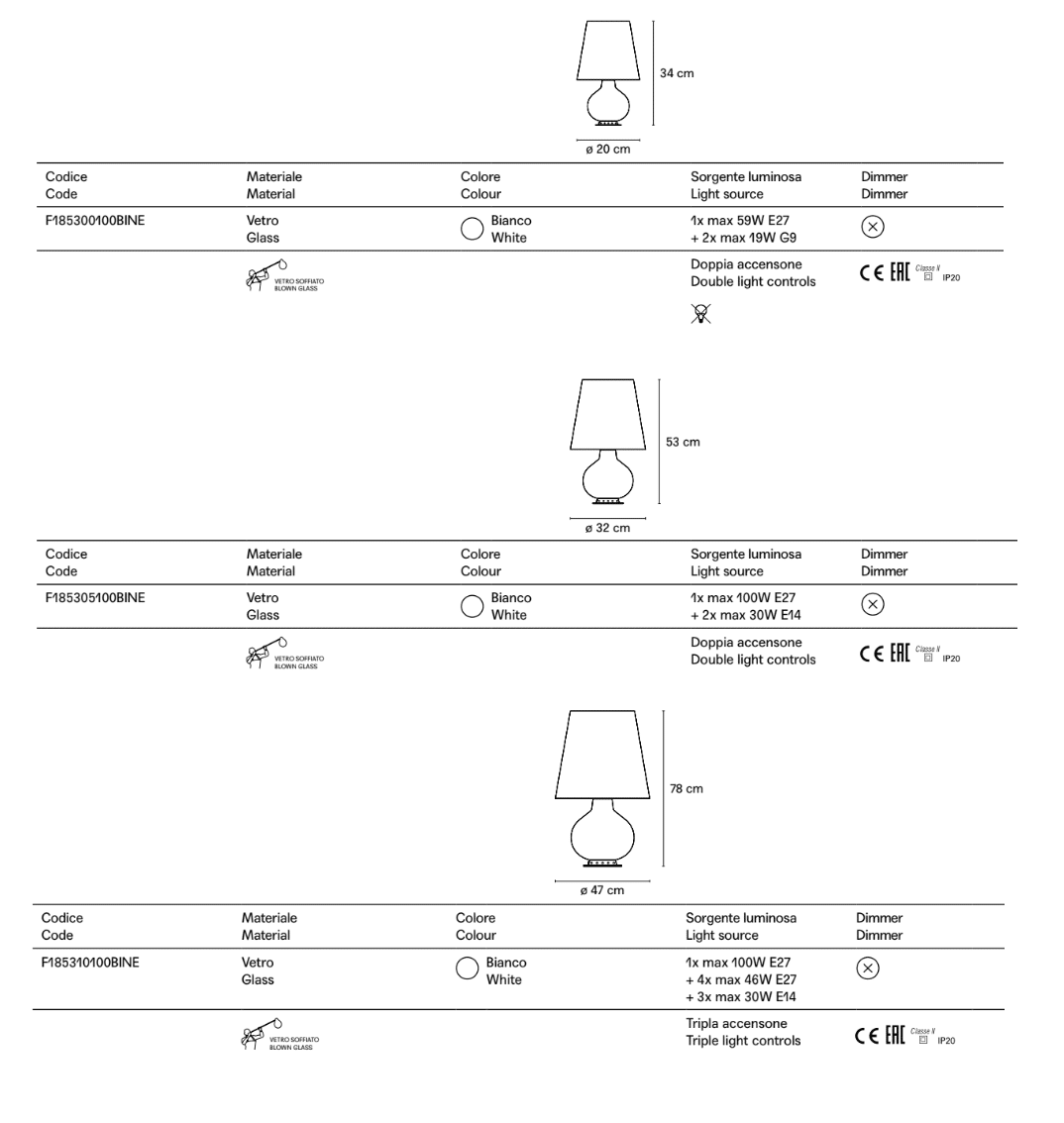 Lampada da tavolo a doppia (misura piccola e media) e tripla (misura grande) accensione. Montatura in metallo verniciato bianco. Paralume e base in vetro soffiato bianco satinato. Cavo d’alimentazione e interruttore nero.