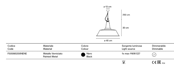Lampada a sospensione. Montatura in metallo verniciato color alluminio, nero con interno bianco. Cavo di sospensione in acciaio inox. Cavo di alimentazione trasparente.