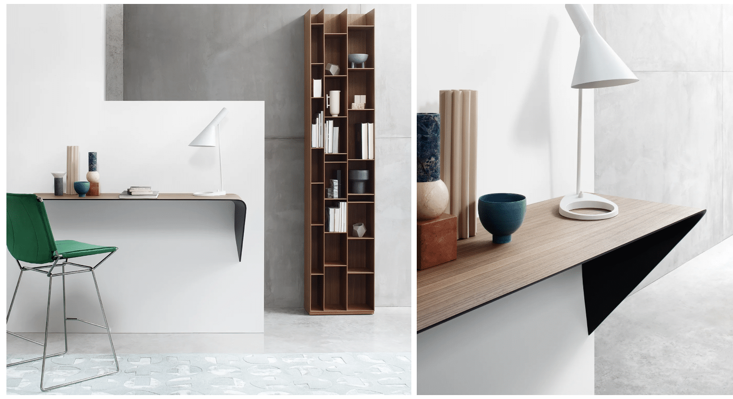 Mensola-scrivania pensile. La forma essenziale e gli spessori rastremati, conferiscono al prodotto un design e un’immagine unica di forte carattere iconico. Un “accento” in grado di interagire in modo spontaneo con ciò che gli sta accanto, che si presta a differenti e variabili utilizzi.