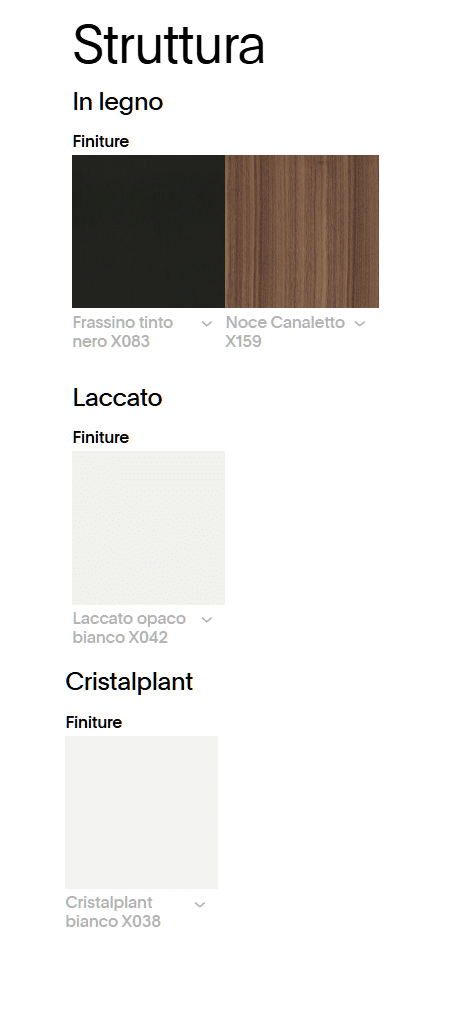 Frassino tinto nero, Noce Canaletto, Laccato opaco bianco
