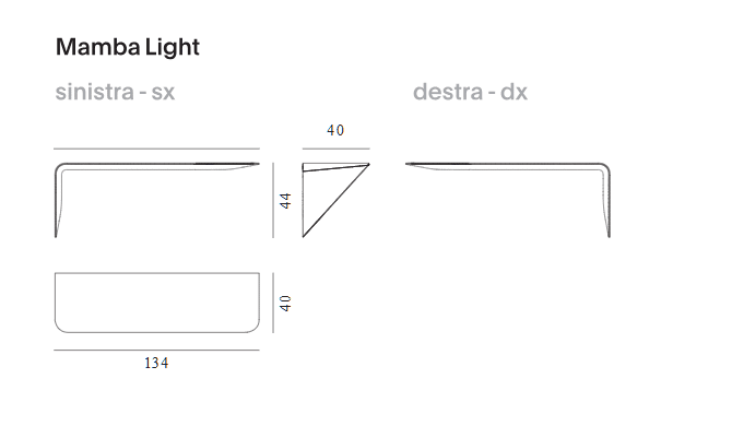 Può essere orientata a destra oppure sinistra. La mensola è realizzata in fibra di legno a media densità, a spessore variabile, curvata in stampo. La parte inferiore in essenza è sempre verniciata nero opaco.