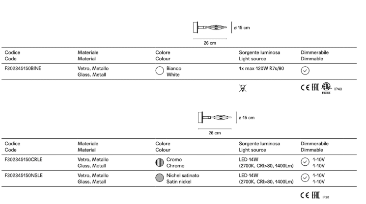Lampada da parete. Montatura in metallo bianco opaco BI (RAL 9003 opaco disponibile solo nella misura 15×20 cm.), cromato CR oppure nichelato satinato NS. Diffusori in vetro satinato. È previsto un riflettore in alluminio anodizzato per luce indiretta e un distanziatore per connessioni elettriche.