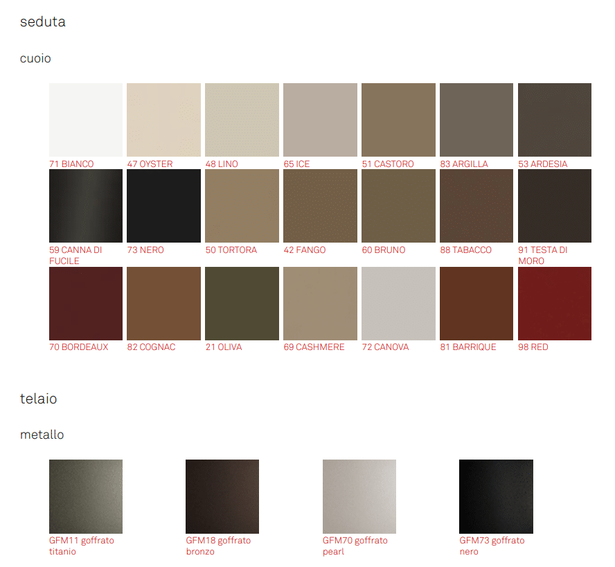 | Colore | 21 Oliva, 42 Fango, 47 oyster, 48Lino, 50 Tortora, 51 Castoro, 53 Ardesia, 59 Canna di fucile, 60 Bruno, 65 Ice, 69 Cachemire, 70 Bordeaux, 72 Canova, 81 Barrique, 82 Cognac, 83 Argilla, 88 Tabacco, 91 Testa di moro, 96 Red, Nero |