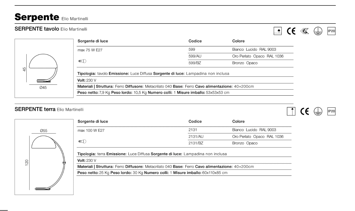 Il suo design senza tempo ha influenzato generazioni di progettisti, ispirando la creazione di numerosi altri prodotti successivamente inseriti nel catalogo Martinelli. In tal modo, la lampada Serpente non è soltanto un elemento di arredo, ma una vera e propria icona del design contemporaneo, capace di mantenere un dialogo costante tra passato e futuro.