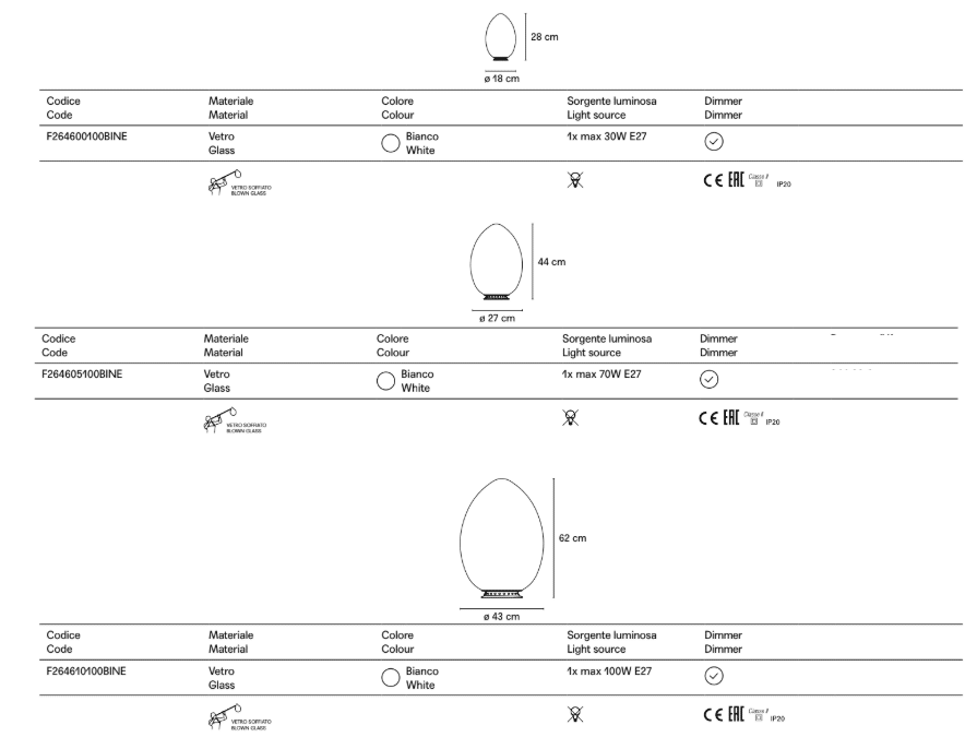Una forma naturale che da sempre è simbolo di perfezione, in cui convivono armonicamente simmetria e asimmetria. Un’idea ironica che conquista. Come in natura, anche nella lampada Uovo il guscio è esempio assoluto di leggerezza: una forma elegante in vetro soffiato bianco satinato che diffonde uniformemente una calda luce avvolgente.